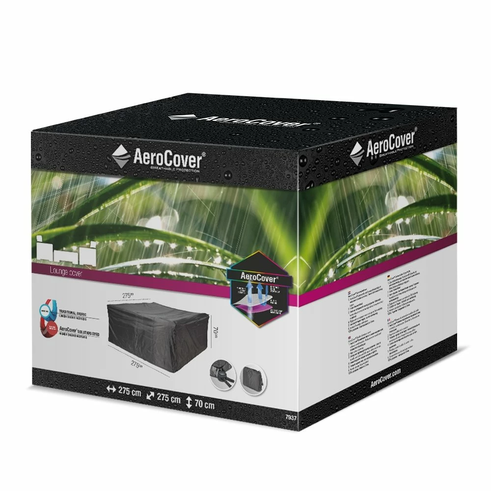 AeroCover loungesethoes. Ademende loungesethoes vierkant voor loungesets 275x275xH70. O.a. geschikt voor loungesets met meerdere elementen of hoeksets met hoge tafel. AeroCovers zijn ademend, waterbestendig, reduceren condensvorming en gaan schimmelvorming tegen. De stof heeft een hoge kleurechtheid dankzij de door en door geverfde vezels. Een AeroCover hoes verlengt de levensduur van uw tuinmeubelen. AeroCovers zijn vervaardigd van sterk en lichtgewicht ripstop polyester. Ze zijn makkelijk hanteerbaar en nemen weinig ruimte in wanneer niet in gebruik. De afdekhoes is voorzien van rijgkoord met 2 stoppers voor een goede pasvorm. Inclusief handige opbergtas. AeroCover stoffen zijn 100% waterdicht, de naden zijn, net als elke ander hoes, spatwaterdicht.