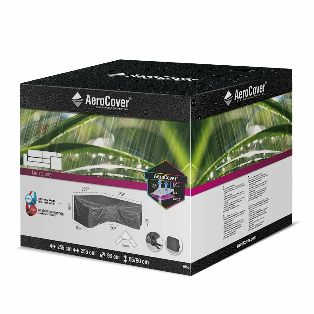 AeroCover loungesethoes voor hoeksets. Ademende loungesethoes voor L-vorm loungeset met grote hoek of trapeze hoek en hoge rug 255x255x90xH65/90. AeroCovers zijn ademend, waterbestendig, reduceren condensvorming en gaan schimmelvorming tegen. De stof heeft een hoge kleurechtheid dankzij de door en door geverfde vezels. Een AeroCover hoes verlengt de levensduur van uw tuinmeubelen. AeroCovers zijn vervaardigd van sterk en lichtgewicht ripstop polyester. Ze zijn makkelijk hanteerbaar en nemen weinig ruimte in wanneer niet in gebruik. De afdekhoes is voorzien van rijgkoord met 2 stoppers voor een goede pasvorm. Inclusief handige opbergtas. AeroCover stoffen zijn 100% waterdicht, de naden zijn, net als elke ander hoes, spatwaterdicht.