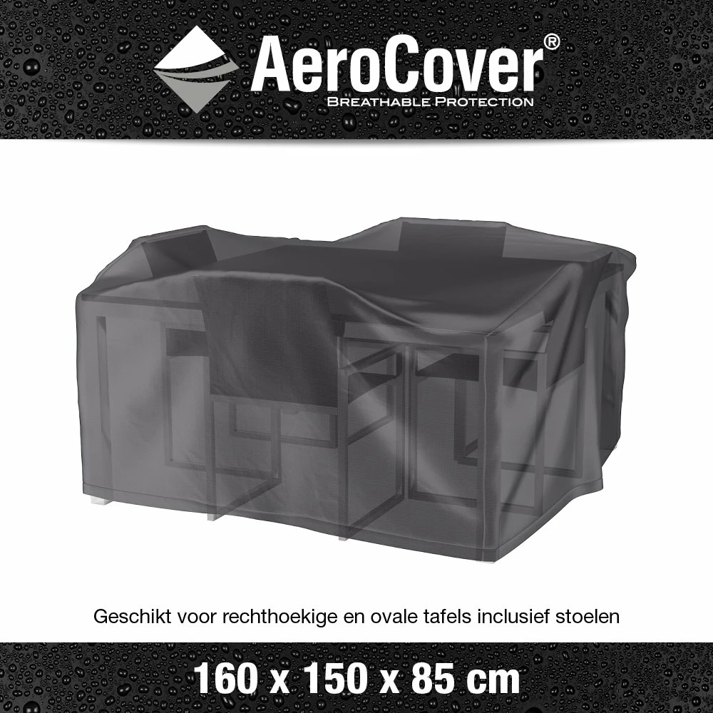 AeroCover tuinmeubelhoes. Ademende tuinmeubelhoes voor tuinset van 160x150cm. O.a. geschikt voor rechthoekige tafels tot 160cm met stoelen. AeroCovers zijn ademend, waterbestendig, reduceren condensvorming en gaan schimmelvorming tegen. De stof heeft een hoge kleurechtheid dankzij de door en door geverfde vezels. Een AeroCover hoes verlengt de levensduur van uw tuinmeubelen. AeroCovers zijn vervaardigd van sterk en lichtgewicht ripstop polyester. Ze zijn makkelijk hanteerbaar en nemen weinig ruimte in wanneer niet in gebruik. De afdekhoes is voorzien van rijgkoord met 2 stoppers voor een goede pasvorm. Inclusief handige opbergtas. AeroCover stoffen zijn 100% waterdicht, de naden zijn, net als elke ander hoes, spatwaterdicht.