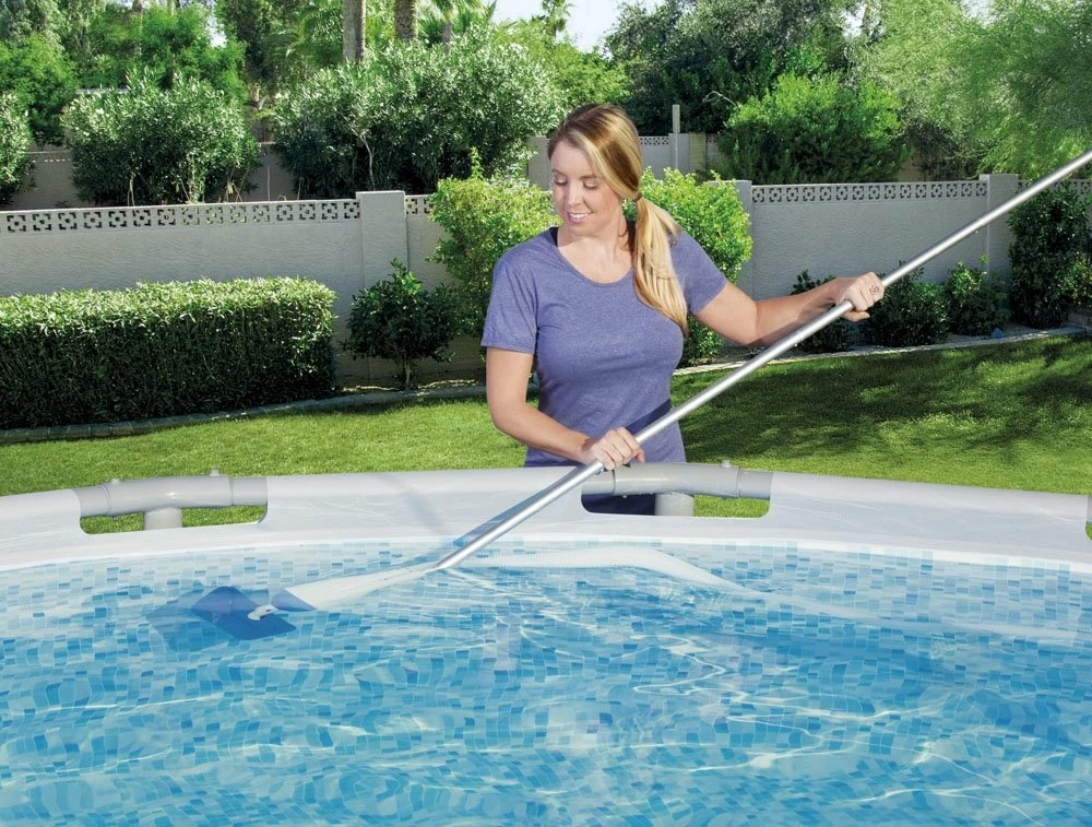 Bodemstofzuigerset voor de reiniging van zwembaden met een max. diameter 457 cm. Aan te sluiten op de filterpomp. Pomp nodig van minimaal 2,0 m³/u. Bodemstofzuiger met 2 mondstukken, waarvan 1 met borstel, slang (Ø 32 mm en 600 cm lang), steel (190 cm)