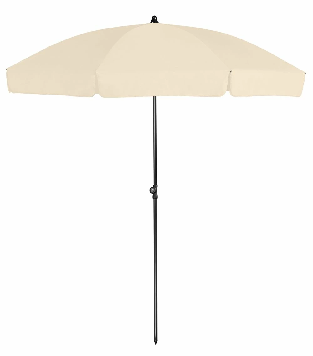 Parasol Aruba ø200 volant. Klassiek, kantelbaar model parasol met 160 grams polyester doek in de kleur ecru. De volant geeft extra schaduw bij een laagstaande zon. Kan ook als strandparasol worden gebruikt en rechtstreeks in de grond worden geprikt.