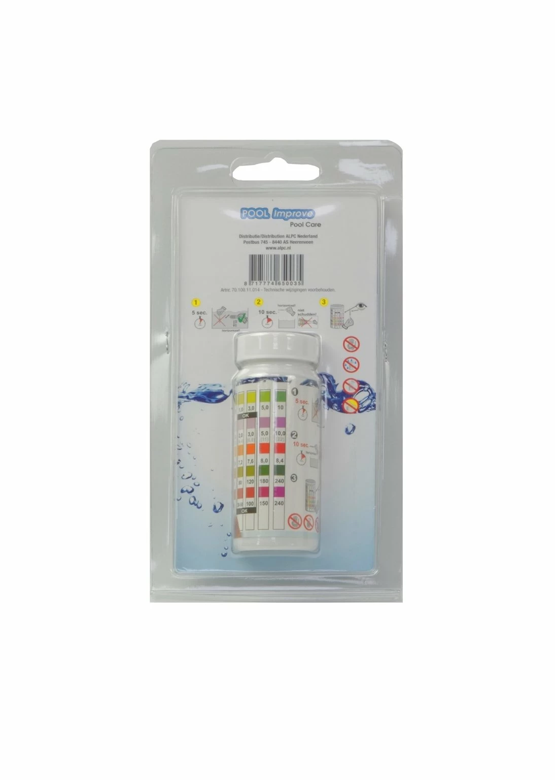 De strips kunnen gebruikt worden voor het testen van zwembadwater. Deze strips worden onder water gedompeld waarna de kleuren kunnen worden vergeleken. Deze 5 in 1 strips meten het vrije chloor, totale chloor, pH-waarde, cyanuurzuur en alkaliteit. De strips zijn per 10 verpakt in aluminiumfolie voor betere testresultaten. Per verpakking zitten er 50 teststrips in. Voor gebruik de gebruiksaanwijzing aandachtig doorlezen.