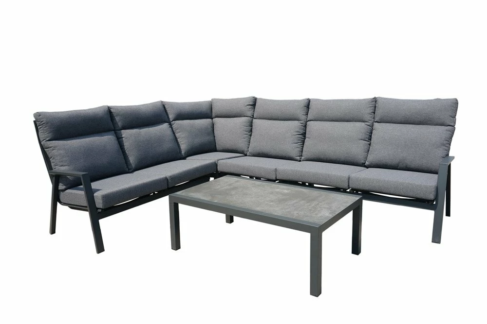 De HAVANA hoek loungeset heeft een zwart aluminium frame. Hierdoor is deze set licht in gewicht, erg sterk en goed te onderhouden. Daarom wordt aluminium veel gebruikt in de productie van tuinmeubelen. De SOL salontafel heeft een aluminium frame en is voorzien van een keramisch tafelblad. Deze tuinset wordt inclusief grijze kussens geleverd. Dat wordt heerlijk genieten deze zomer