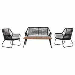 De “NAPOLI loungeset zwart” is een moderne en eigentijdse loungeset van het merk Royal Seasons. De set wordt geleverd met 2 NAPOLI loungestoelen, een NAPOLI bank en een NAPOLI salontafel, allemaal in de kleur zwart. De stoelen en bank hebben een stalen frame met zwart gekleurd touw (5 mm dik) en de tafel heeft een stalen frame met een acacia houten tafelblad. Deze loungeset is een perfecte aanvulling op elke tuin of terras en biedt comfort en stijlvolle ontspanning voor minimaal 4 personen.