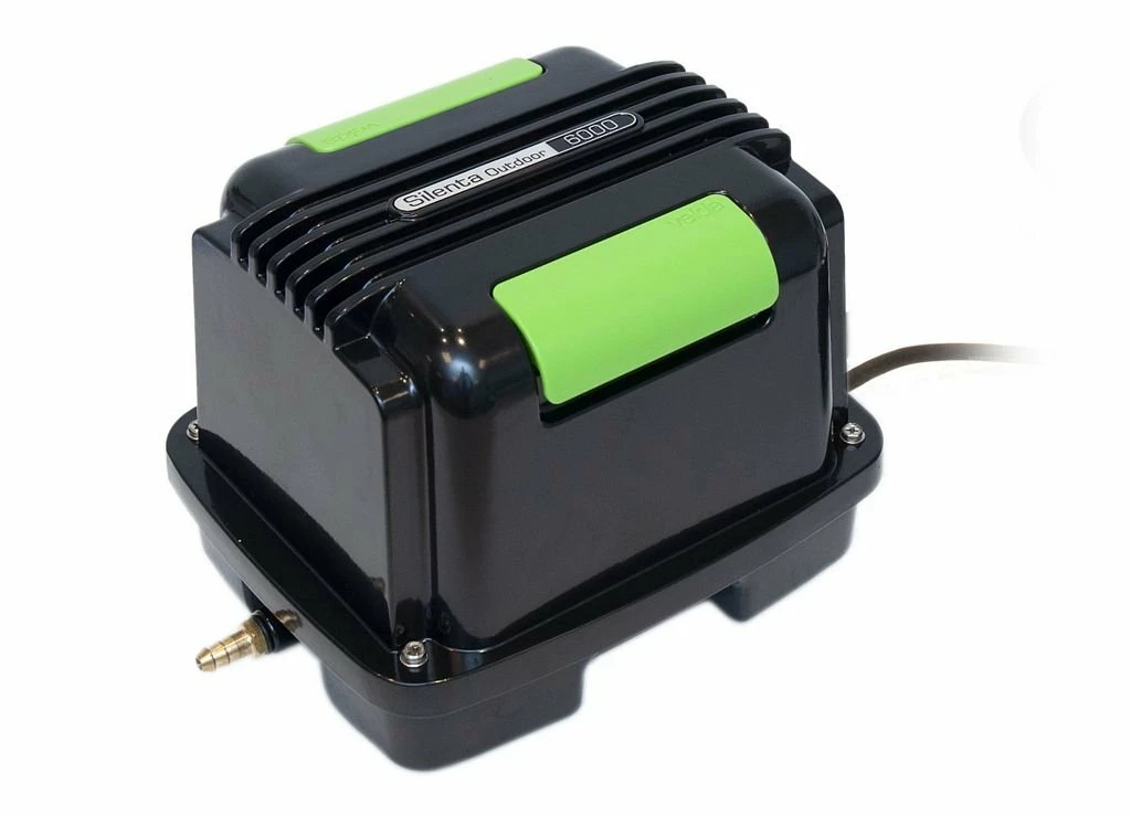 De Silenta Outdoor pomp is bestand tegen regenwater en staat naast de vijver. De luchtslang voert zuurstof naar de luchtsteen die in de vijver hangt. In de vorm van luchtbellen wordt de zuurstof afgegeven aan het vijverwater. Tegelijkertijd voeren de bellen schadelijke gassen af die zich in de diepere waterlagen bevinden. Zo voorkom je verstikking van het microleven en de vissen in de vijver. De luchtpomp met robuuste behuizing heeft een laag geluidsniveau en lange levensduur.Vezelversterkte luchtslangMet grote luchtsteenStille motorLange levensduur• zomerWanneer de watertemperatuur stijgt, treedt vaak zuurstofgebrek op. De vissen komen naar de oppervlakte om lucht te happen. En als je algen verwijdert, valt er ook een belangrijke zuurstofbron weg. Beluchting van de vijver biedt dan uitkomst. De luchtbellen geven zuurstof aan het water en voeren schadelijke gassen af.• winterWanneer de vijver dichtvriest in de winter, komt vissterfte door verstikking regelmatig voor. Hak echter nooit een wak in het ijs, want de trillingen zijn schadelijk voor je vissen. Beluchting van het water is dan beter. De luchtbellen houden de vijver ijsvrij en het water rijk aan zuurstof.Vijf modellen verkrijgbaar: Silenta 1200, 1800, 3600, 4800 en 6000